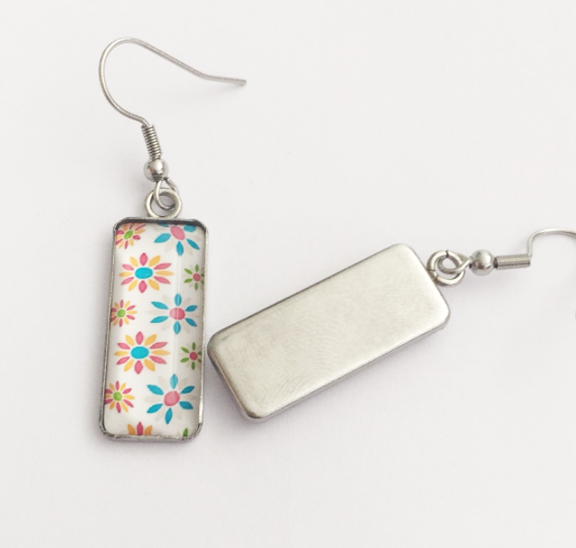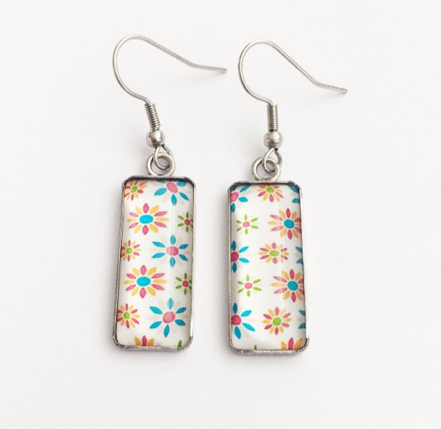 Colourful Flowers Drop Earrings Brighten your look with these playful and vibrant drop earrings, featuring a lively pattern of colourful stylised flowers. Crafted with stainless steel hooks and backs, each pendant is topped with a glossy glass dome and measures approx. 25mm x 10mm. Rubber back stoppers are included to keep them secure throughout the day.