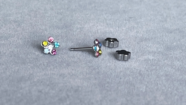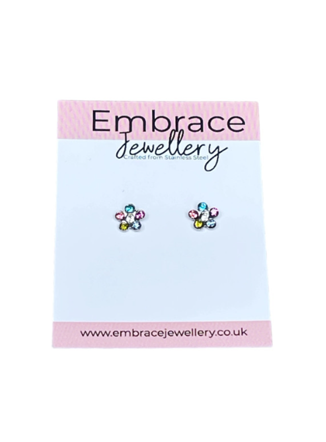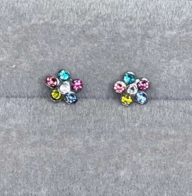 Add a pop of sparkle with these vibrant mini studs, featuring multi-coloured rhinestones in a delicate flower design. Finished with pretty flower-shaped twist-on flat backs that fully enclose the post end—offering charm, security, and snag-free comfort for everyday wear.