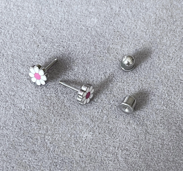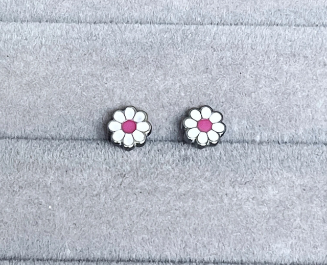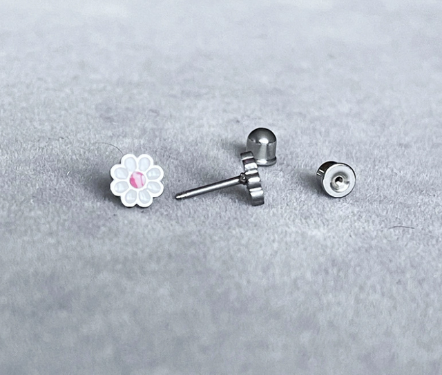 These charming mini daisy studs are crafted from high-quality stainless steel and enamel, with twist-on dome-shaped comfort backs that fully enclose the post end—making them extra comfortable, safe, and snag-free for everyday wear.