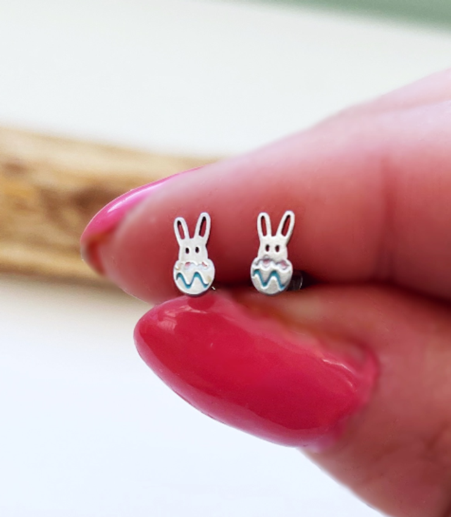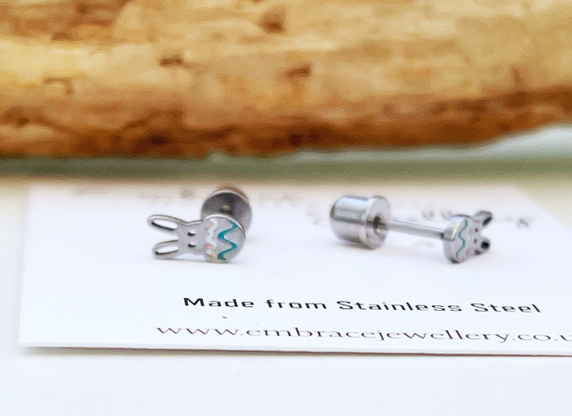 Super cute and full of character, these mini studs feature a playful rabbit nestled inside a pastel egg. Crafted from high-quality stainless steel and finished with twist-on dome backs that fully enclose the post end—making them safe, secure, and snag-free for everyday wear.