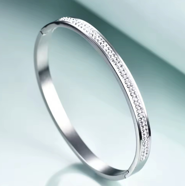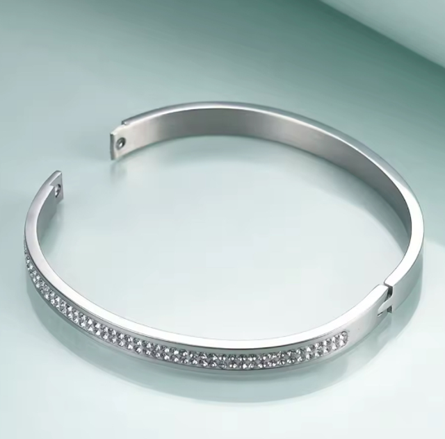 Rhinestone Bangle Make a statement with this stunning stainless steel bangle, adorned with two rows of dazzling rhinestones. Its hinge opening ensures a secure fit, while the sleek profile adds sparkle to any occasion.