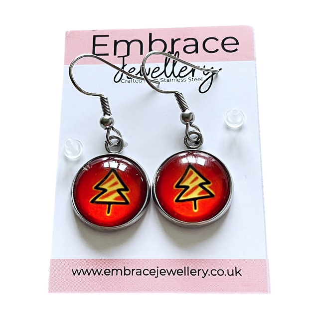 These stainless steel drop earrings feature a Christmas tree design with a glass front. Measuring approximately 14mm, they’re lightweight and comfortable—perfect for adding a festive touch to your look.