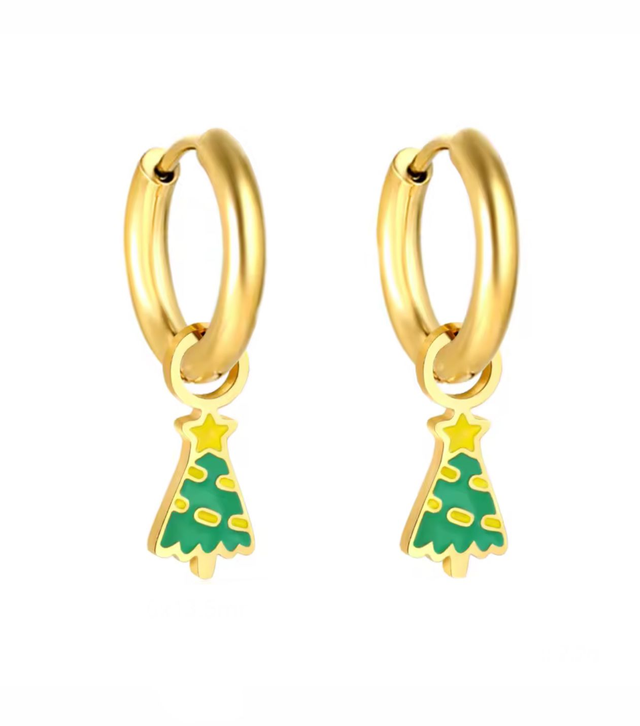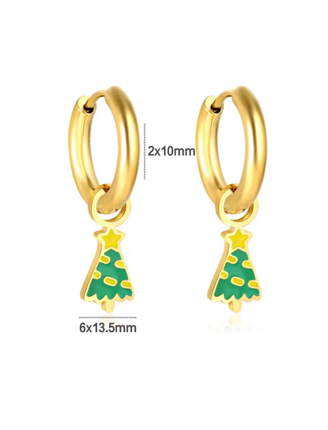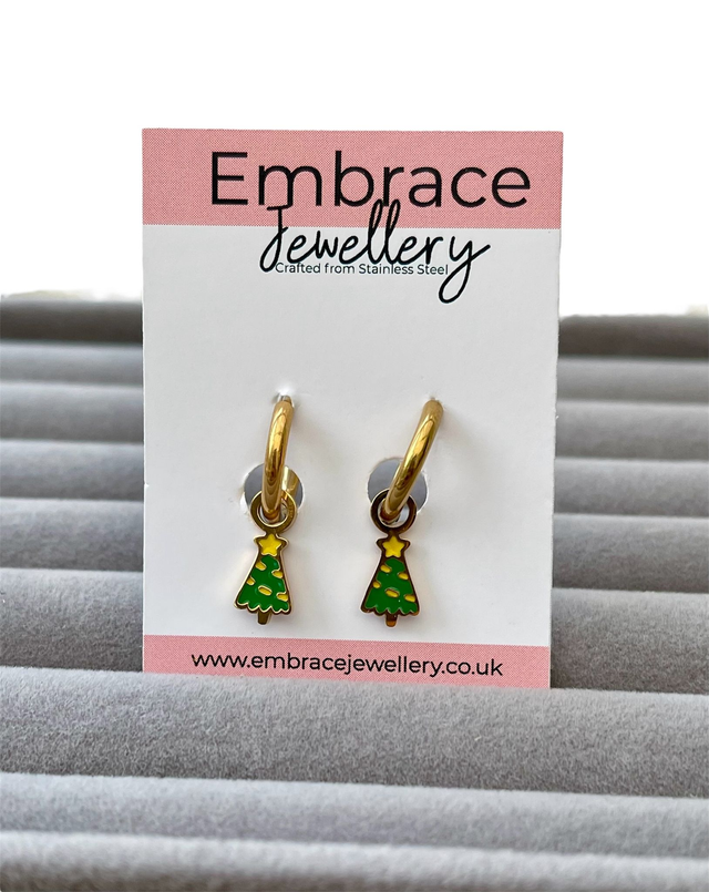 These festive Christmas tree huggies are crafted from stainless steel with a gold PVD coating and finished with glossy green and yellow enamel. The secure huggie hoop closure offers a smooth, comfortable fit — ideal for everyday wear throughout the holiday season.