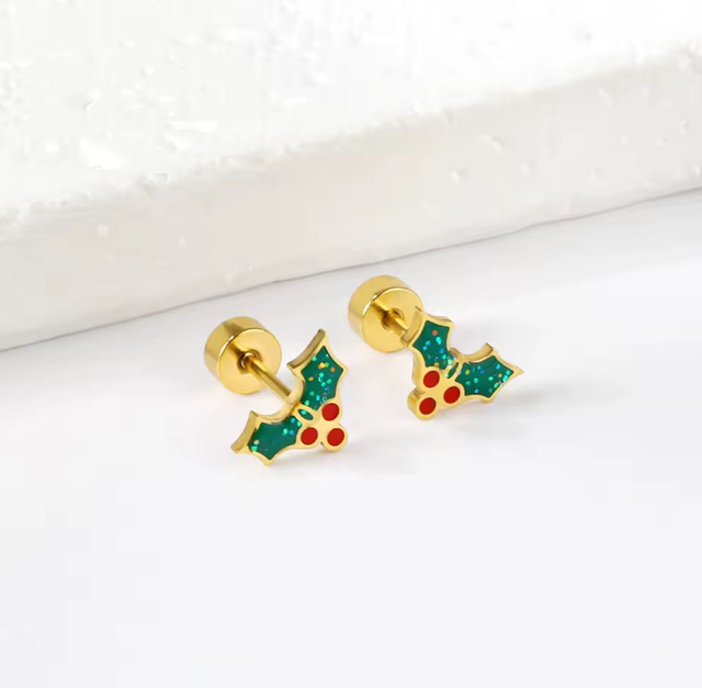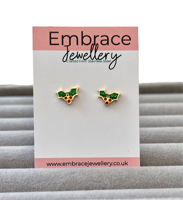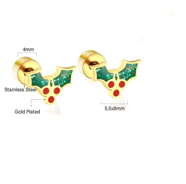 These festive mini holly studs are crafted from stainless steel with a durable gold PVD coating and finished with green and red enamel, accented by a subtle hint of glitter. The twist-on flat back comfort fastener keeps them secure, comfortable, and fully enclosed — safe and snag-free. They’re designed for all-day comfort, making them perfect for everyday wear throughout the holiday season.