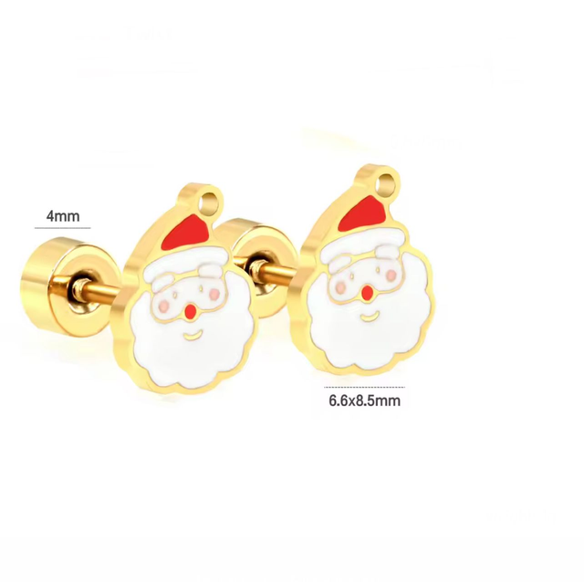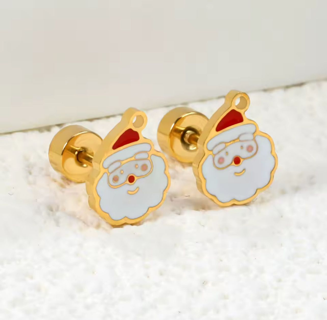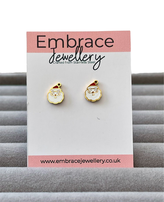These festive Santa mini studs are crafted from stainless steel with a durable gold PVD coating and finished with white and red enamel for a cheerful seasonal touch. The twist-on flat back comfort fastener keeps them secure, comfortable, and fully enclosed — safe and snag-free. They’re designed for all-day comfort, making them perfect for everyday wear throughout the holiday season.