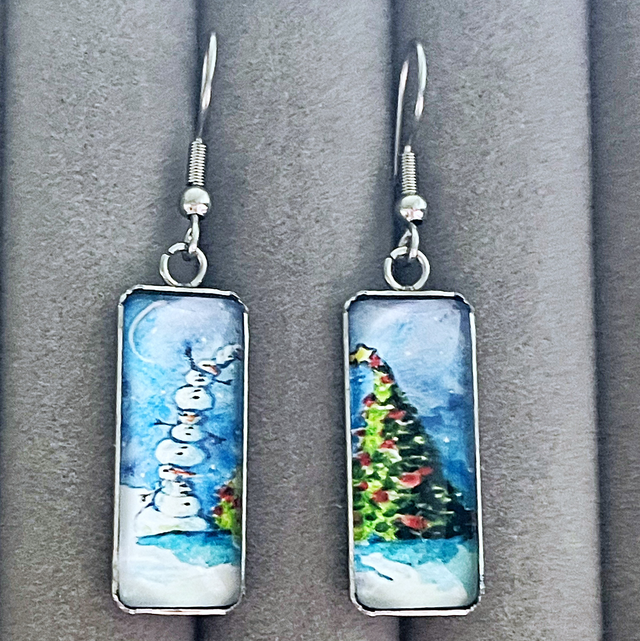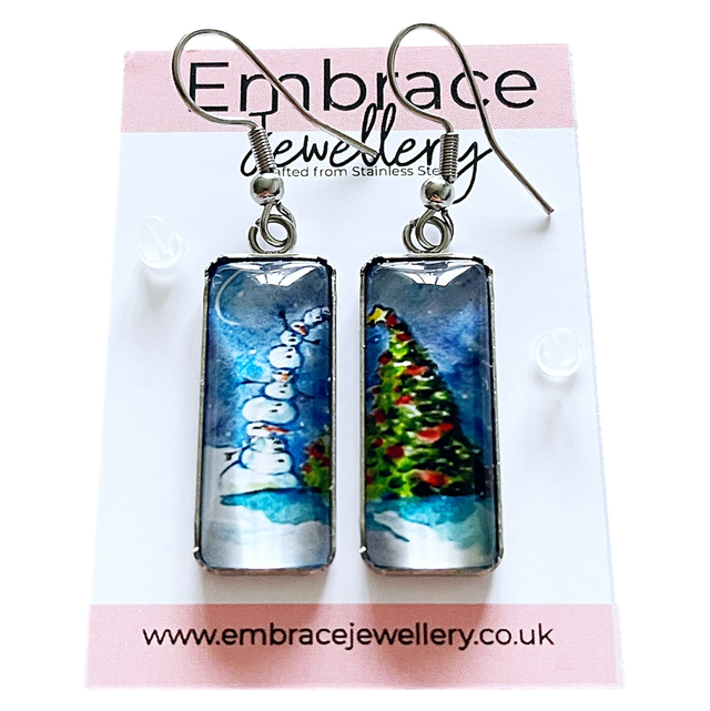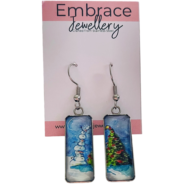 Snowman Tower & Christmas Tree Drop Earrings